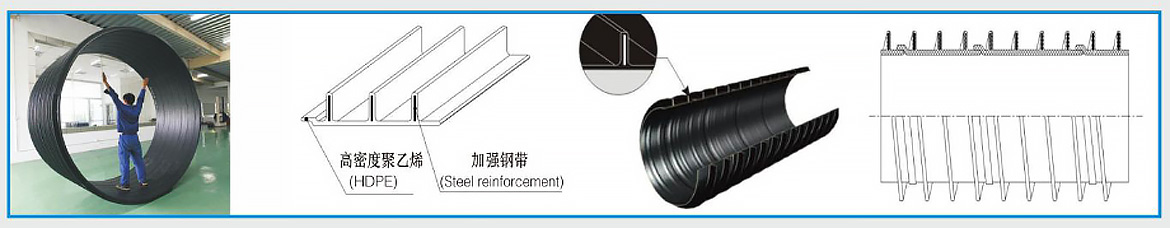 HDPE塑su鋼gang纏chan繞rao排pai水shui管guan由you塑su鋼gang複fu合he的de異yi型xing帶dai材cai經jing螺luo旋xuan纏chan繞rao焊han接jie製zhi成cheng。成cheng型xing的de管guan材cai呈cheng螺luo旋xuan直zhi肋lei結jie構gou,管guan壁bi外wai表biao麵mian有you等deng間jian距ju螺luo旋xuan環huan繞rao的de肋lei片pian加jia強qiang。肋lei片pian是shi由you普pu通tong碳tan素su結jie構gou鋼gang帶dai外wai包bao覆fu聚ju乙yi烯xi構gou成cheng,通tong過guo聚ju乙yi烯xi包bao覆fu使shi鋼gang帶dai與yu聚ju乙yi烯xi渾hun然ran一yi體ti。其qi管guan壁bi構gou成cheng封feng閉bi的de流liu體ti通tong道dao,加jia強qiang鋼gang帶dai保bao證zheng了le管guan材cai的de環huan剛gang度du。加jia強qiang鋼gang帶dai的de厚hou度du與yu寬kuan度du,根gen據ju管guan材cai直zhi徑jing、環剛度要求不同而分別設計確定。